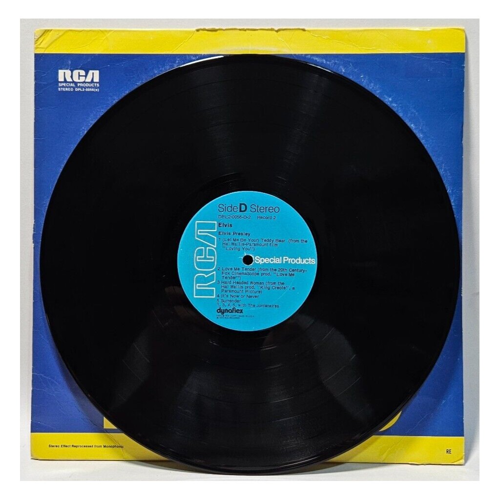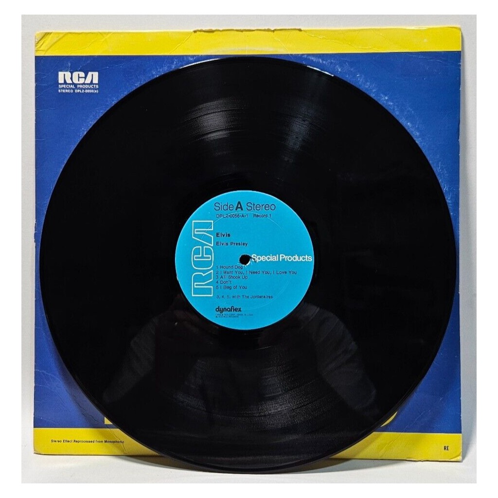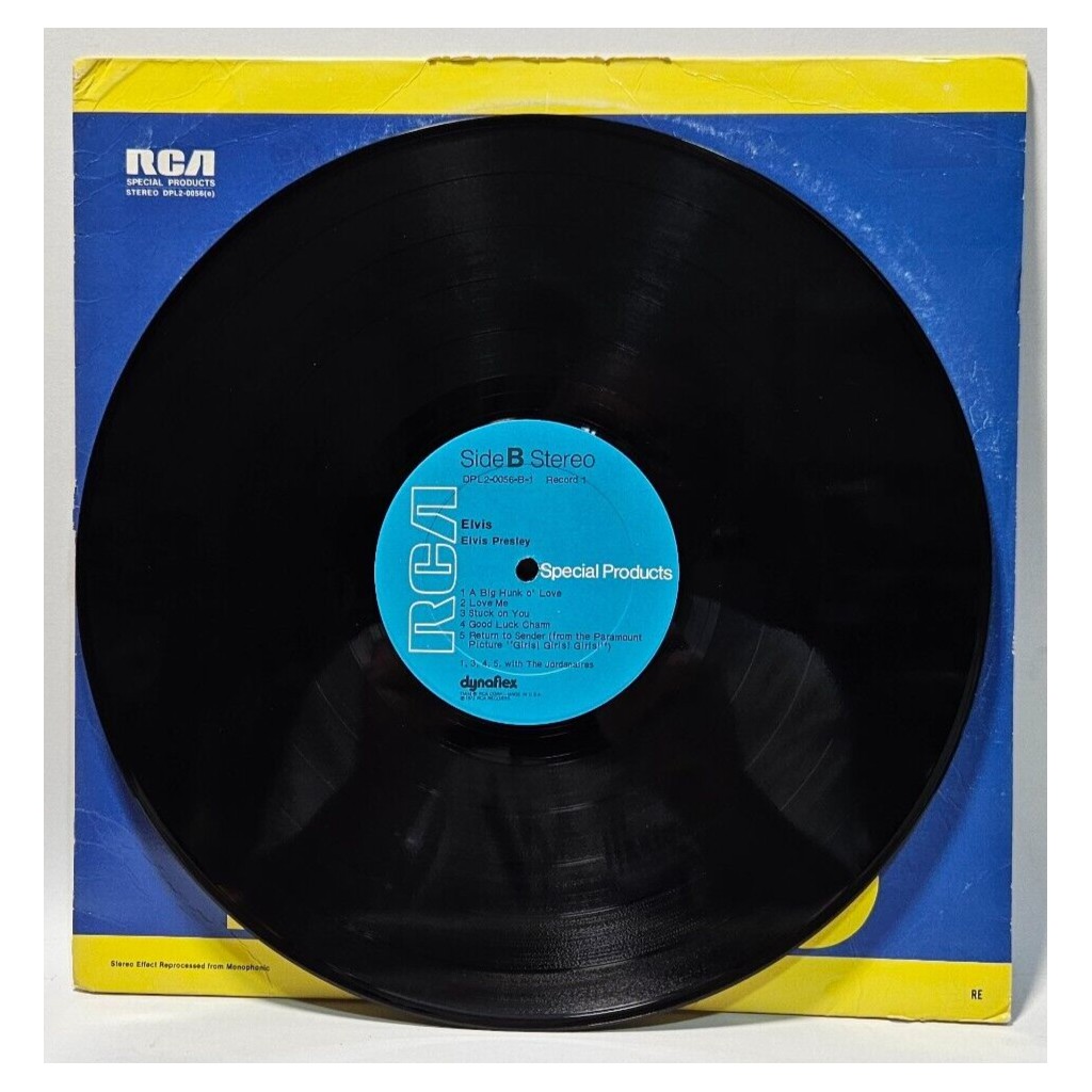 Elvis Presley – Elvis – RCA Special Products DPL2-0056(e) – EXÂ The record has been cleaned using ultrasonic technology and is in strong EX/EX condition bordering on NM. The cover has seen many betters days, only a G+ because of seam splits, wear and age!