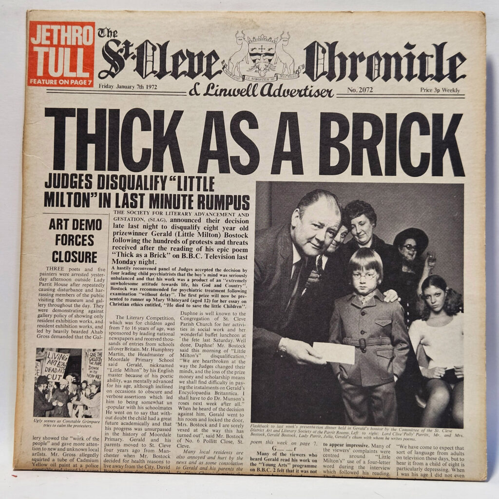 Jethro Tull - Thick As A Brick - 1972 Rock - EX - Ultrasonic Clean - Very early pressing, Reprise, not the Chrysalis pressing, this is an early Columbia Records Pressing Plant, Terre Haute pressing as indicated by the "T"'s in the runouts. Runouts are etched, except for the stamper ID stamped, located opposite of the matrix proper. Tan Reprise labels. Cover includes 12-page gatefold-style fold-out 'spoof' local newspaper. Labels DO NOT show track times. Sleeve and newspaper are in superb shape, just some aging on the sleeve itself. Matrix / Runout (Side A runout, variant 5): T1 MS-2072 31378-2-1 Matrix / Runout (Side B runout, variant 5): 2T MS-2̶0̶7̶0̶2̶ 2072 31379-2-1 - The record has been cleaned using ultrasonic technology and is in strong EX/EX condition. The cover is crisp, only a VG+ because of age!