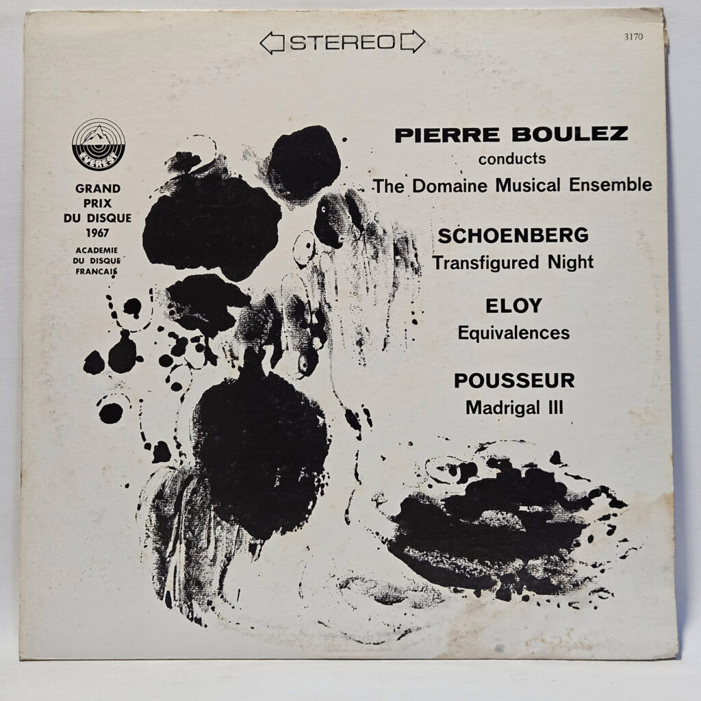 Pierre Boulez - Pierre Boulez Conducts Schoenberg, Eloy, Pousseur - 1968 Classic - It's a shame about the staining front and back on the lower right sleeve, but the record is magnificent. - The record has been cleaned using ultrasonic technology and is in strong EX/EX condition. The cover is crisp, only a VG+ because of age!