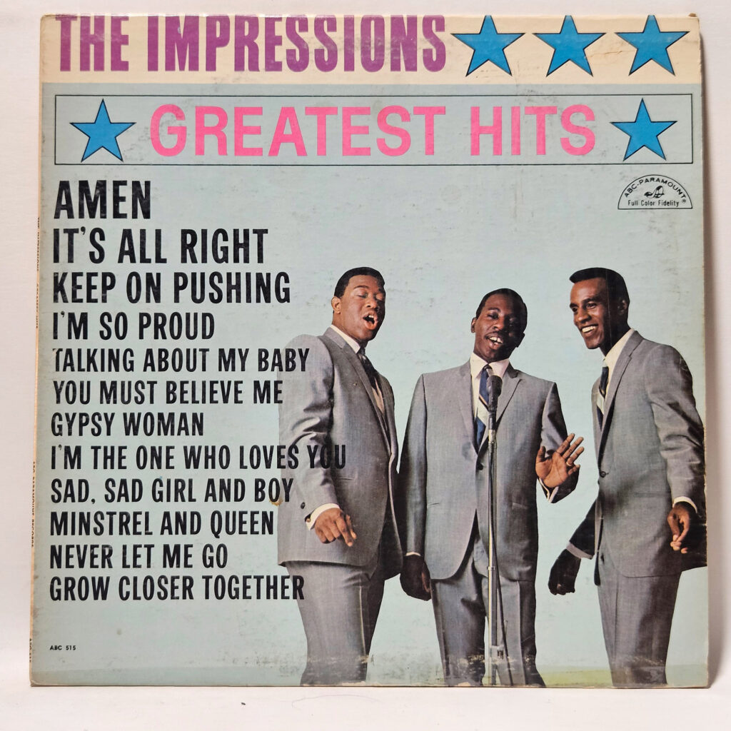 The Impressions - Greatest Hits - 1965 Funk / Soul - EX - Ultrasonic Clean - bottom seam is taped, but the record is tight; easy EX. - The record has been cleaned using ultrasonic technology and is in strong EX/EX condition. The cover is crisp, only a VG+ because of age!